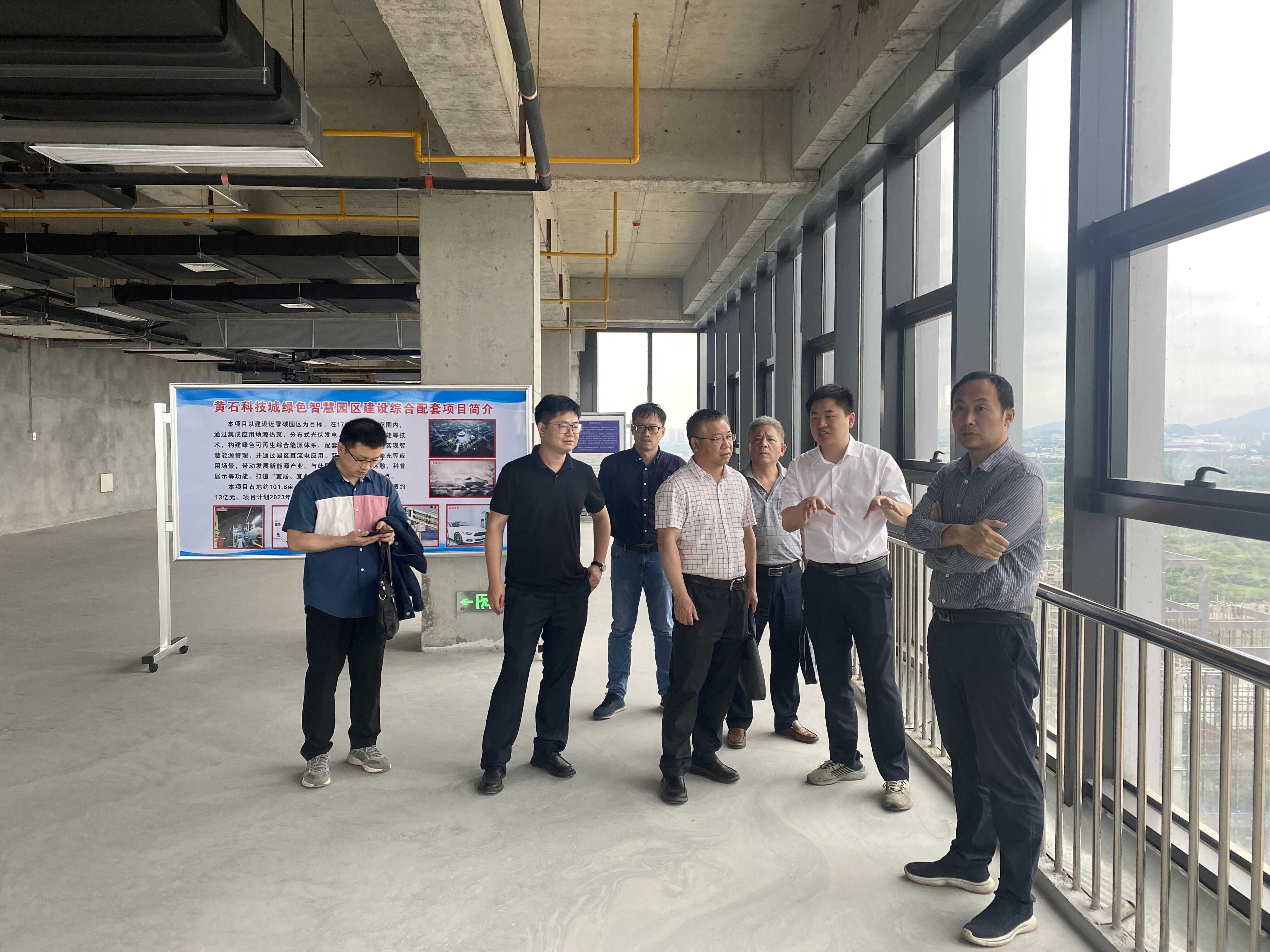 王源智、孙瑞峰一行参观了黄石科技城一期科创大厦,市高新投公司有关同志介绍了科技城布局规划及建设等情况,并就产学研合作创新中心装修方案等工作进行详细商讨。